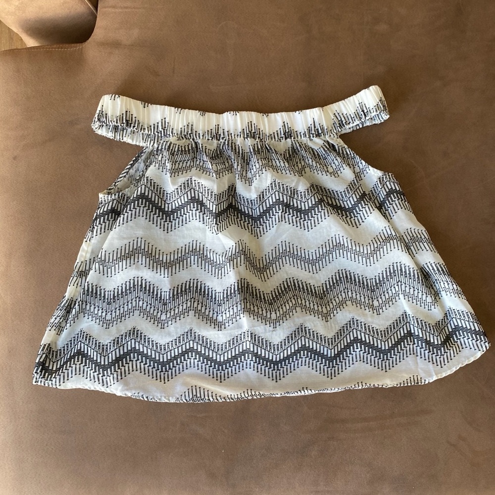 Off shoulder black and white top. Perfect for summer! I don’t know the exact size, but I am pretty sure it is a small.