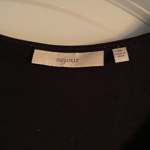 Black with gold-ish metal beading along one side. Top sits off shoulder - either one. Some rushing along sides to accent waist. Bought from Nordstrom.