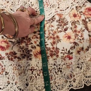 this adorable top has straps to keep shoulders in place. wear them on or off the shoulder. ruffle bustline will hide larger belly if needed. lace edges will also take the eyes away from belly.