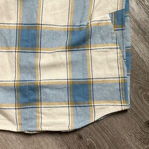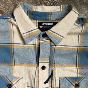 Excellent condition Off The Grid Surplus Destroyer Flannel shirt in a light blue, white, and yellow plaid colorway. Armpit to armpit 22”/shoulder to shoulder17”/length 30”/sleeve 26”