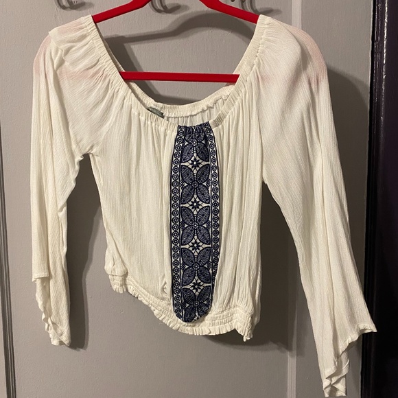 White off the shoulder blouse Blue detail down the center Flowy sleeves Great for summer