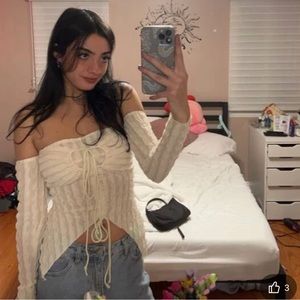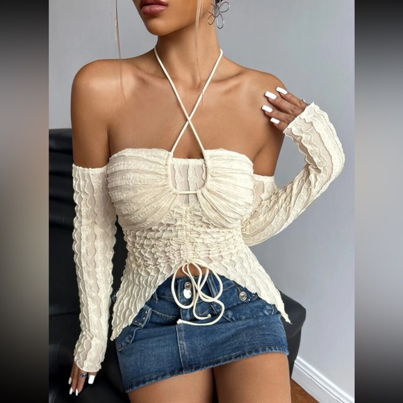 Off The Shoulder Drawstring Ruched Front Textured Top Super cute! Stretch sexy material. Beige color