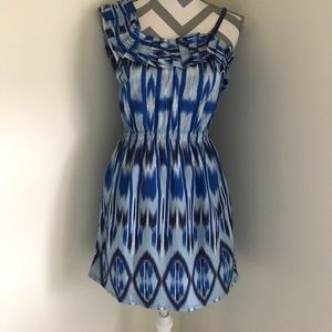 Off the Shoulder strap dress. Color of blues. 100% Polyester.