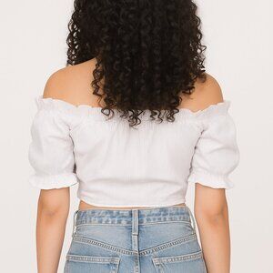 Sleeves & Neckline: Short puff sleeves with an off-the-shoulder neckline that highlights the shoulders and adds a stylish touch.