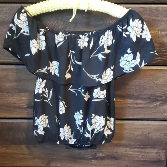 Black floral off the shoulder top by Sienna Sky has elastic bottom hem and pretty white floral pattern.