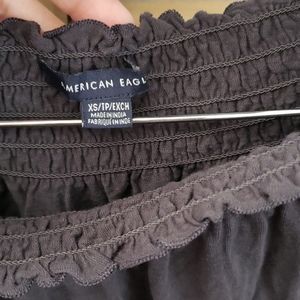 The cutes long sleeve off the shoulder AE top. Blackish gray with stunning pink and coral flowers on the sleeves. So cute with a pair of shorts! Good condition! Size XS.