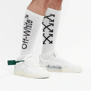 Step into the new season in style with these crisp white sneakers from the iconic Milan-born fashion house Off-White. The smooth leather uppers provide optimal comfort and durability while the bouncy rubber outsole supports your step. You’ll find signature arrow motif branding adorning the side wall along with black printed branding too for a subtle monochrome finish.