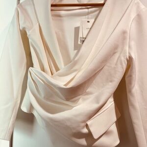 Beautiful all year around off-white A.L.C suit. Wrap jacket and flare pants. This A.L.C. matching set features a sophisticated wrap-style V-neckline (can fall on the shoulder) and a fitted waist, complemented by flare pants with a bottom slit that create a flowing silhouette. The crisp white color adds a modern touch, making it perfect for winter holiday or summer events. Gorgeous! NWT. Never worn