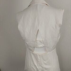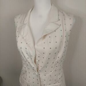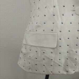 This is an ff white blouse by the brand fair child in size small. No stains, great condition. Silver studs make a polka dot pattern. faux pockets, collar, cut out back. one button.