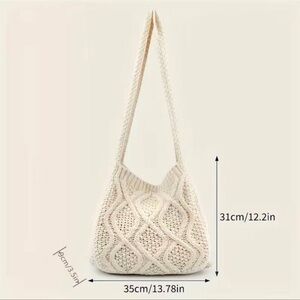 Cream / Off White Crochet Knit Handbag. Can be worn over the shoulder or crossbody. Super soft with a snap closure. Approximately 12” by 12” and 3” deep. Non structured. Perfect for fall and winter! New.