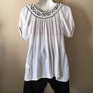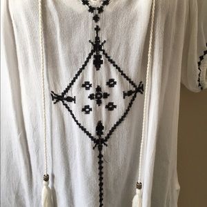 Black embroidered peasant style blouse with two tassels at end of ties. In good condition with a teeny stain shown in the third picture. Perfect with leggings! Top is paired with a maroon bandeau so you can see how see through it is. Let me know if you have any questions about measurements or bundling! I accept almost all offers through the offer button!