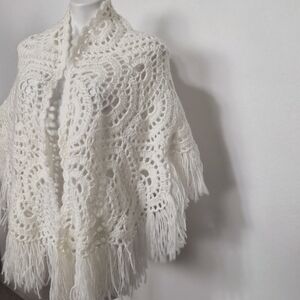 Off White Handmade Crochet Boho Bohemian Y2K Retro Fringe Shawl/Wrap One Size