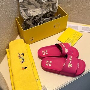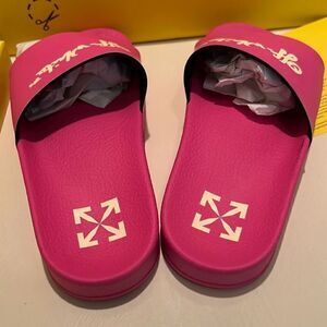 Off White Kids Size 1 Pool Slide Sandals Fuchsia Yellow Script Logo New In Box