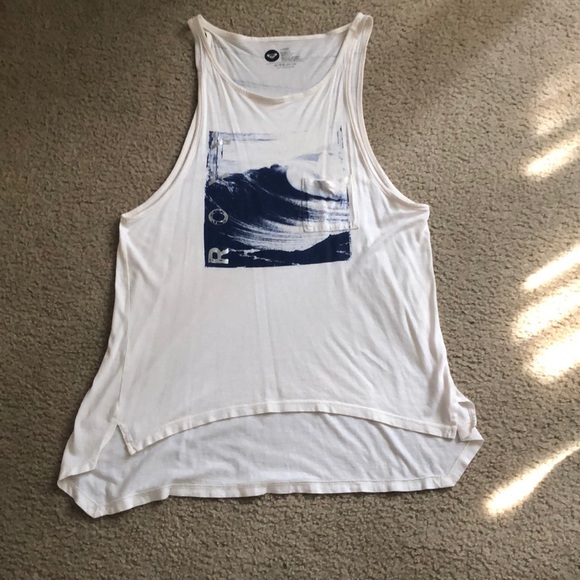 White Roxy tank with low cut sides. Perfect for a day at the beach or as a swim suit cover-up.