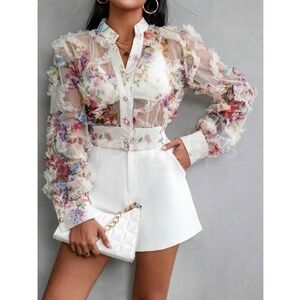 Off White Sheer Floral Ruffle Textured Crop Button Up Blouse Shirt Top