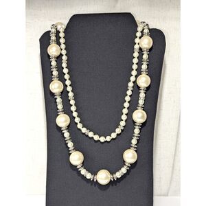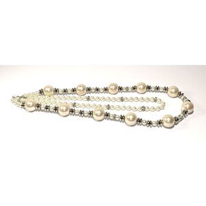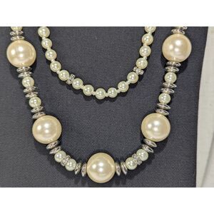 Off white large/small beads, silver tone saucer spacers on long strand, small and seed bead with rhinestone rondel on shorter strand. Measurements are approximate: Drop is 10 1/4 inch, 12 1/4 inch, claw clasp, 2 1/2 inch extension.