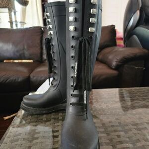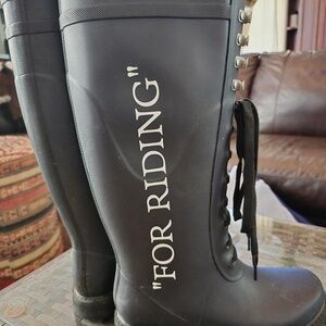 boots pair a classic below-length silhouette with a slogan-print to the side.