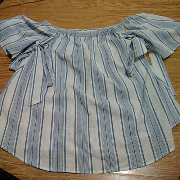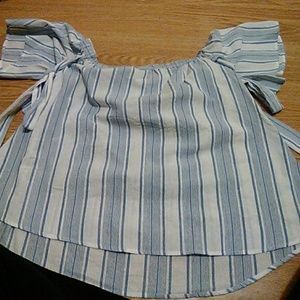 You could either have it off your shoulders or on, super cute! Perfect for a night out, or I was thinking Easter lol. Also has ties , I tied them in bow underneath, you could also tie them anyway you'd like, be creative. Soft blue & white stripes. ( Not a crop top!)
