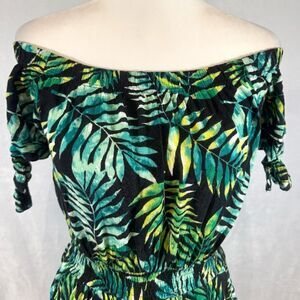 Off shoulder smocked tropical leaf print romper with pockets size small