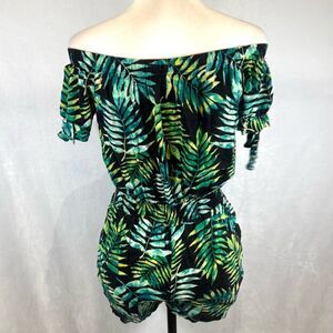 Off shoulder smocked tropical leaf print romper with pockets size small