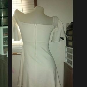 Item is stain free fom smoke free home worn once. White/ivory mini dress .off shoulder. Stretch material.