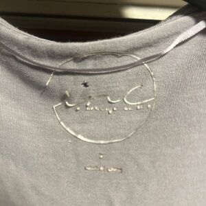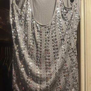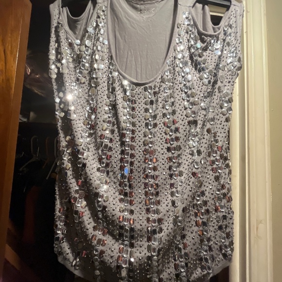 Shining bright grey shirt with mirror like sewn on. The sleeves are short but also off and the shoulders. It’s cute with jeans for a party or for just dinner out.