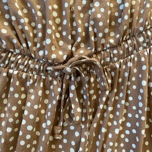 Off the shoulder tan/taupe dress with white polka dots!! Excellent pre-owned condition! Size 10