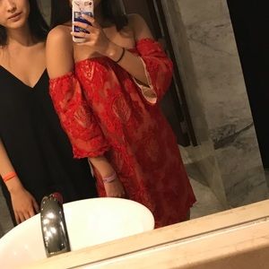 Lightly worn, no signs of wear. Red lace pattern with fully lined tan layer. Dry clean only. Bought from Nordstrom. Brand is Storee. Size XS