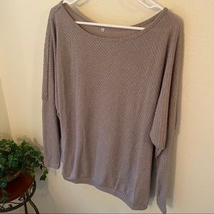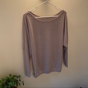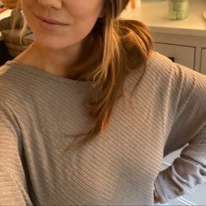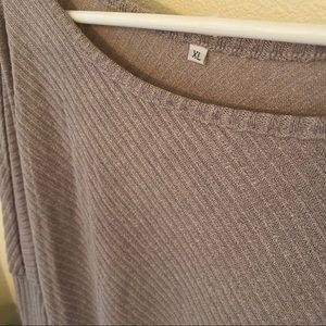 Such a beautiful color! Grey with a mauve undertone. Can be worn as normal, or easily and comfortably fits off the shoulder. Can be worn tunic length or tucked under as a short style. Very light and breathable but not see through. No flaws. Like new. Model is a size large.