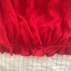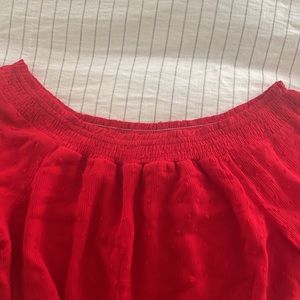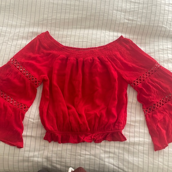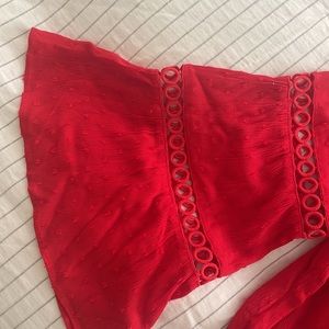 This beautiful red off the shoulder top consist of bell sleeves, laser cut outs and small polkadots to elevate the look.