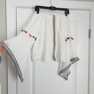 Elastic band throughout entirety of shirt top. Loose bell sleeves with pom pom detail. Never worn.