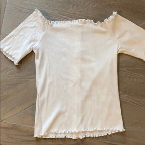 NEVER WORN! Color is White. ribbed cotton material. Can be worn off the shoulder or pulled up on the shoulder. button down detail. Scrunched hem