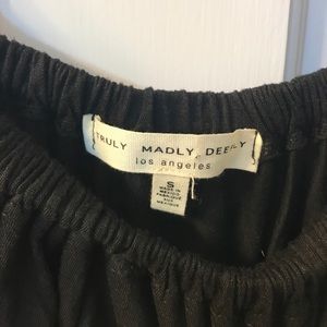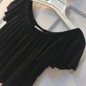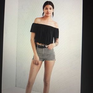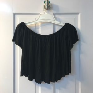 stretchy, soft fabric with a cut off bottom, short sleeve sleeves that fit off the shoulders with an elastic band. great to pair with high rise shorts. only worn once and in great condition