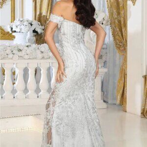 Off the shoulder formal dress.Silver rose gold mother of the bride new fitted