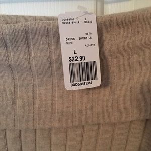 Light cream colored, off the shoulder bodycon dress. Extremely flattering on! Professional photo shows true to life coloring.