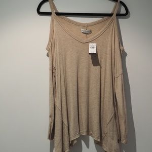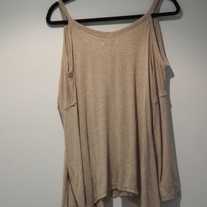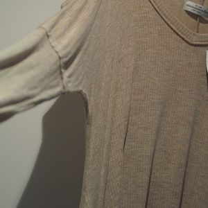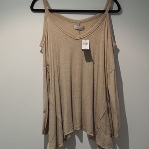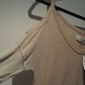 A tan knit that is off the shoulder with long sleeves attached. 96% viscose 4% elastane