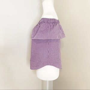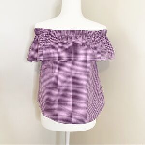 Purple and white off the shoulder elasticized checked top. Country style and would look great with jeans, denim skirt or cut off shorts.