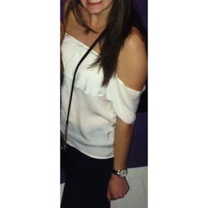 Sheer white strapless, off the shoulder shirt, with ruffle along top. Elastic above breast, no elastic on arms