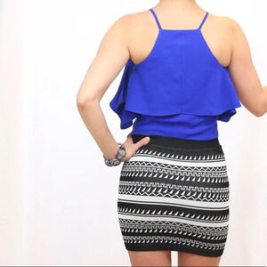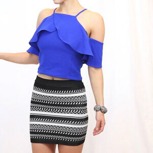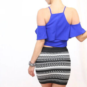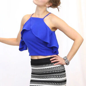 Two looks in one top! Wear with a ruffled off the shoulder look or as a cropped high neck tank without any arm coverage. Zipper closure. Top available in pink or blue.