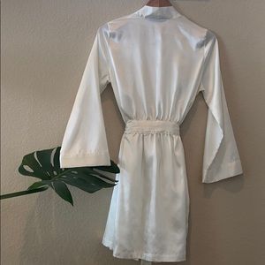 Elegante off white satin robe! Perfect for brides and or honeymoon! Robe has pockets and attached sash. Super soft and in perfect condition!