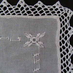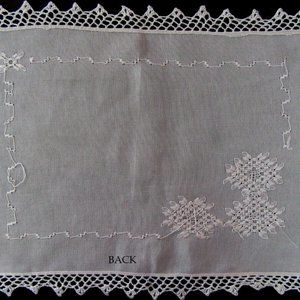 Delicate off white placemats measure 20" x 16" including lacey trim. These are in perfect condition and seem unused. Price is for a set of 4. Lovely for a luncheon, or used as doilies under flower arrangements. Material may be a cotton blend. No tags.