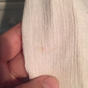 Off white tank top, worn twice on a cruise. One tiny makeup mark on the left side, could probably come out easily. No tears. Smoke free home. Still super cute! Great and light in the summer.
