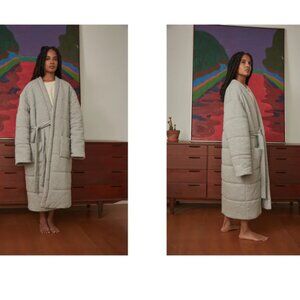 The Homecoat in Sweatshirt is a combination of premium cottons – classic super soft French Terry forms the outside, and 'sanded' cotton jersey lines the inside (specially fabricated to give it a velvety soft finish). It’s filled with recycled polyester quilting (a combination of post industrial and post consumer waste, equivalent to 38 recycled plastic bottles). Plus it's machine washable.