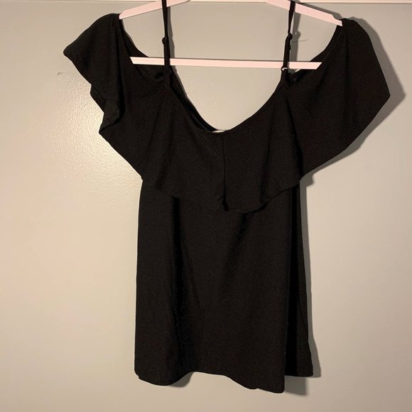 Black off shoulder blouse with frill across neckline.