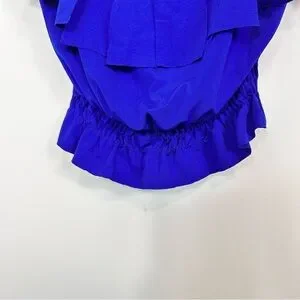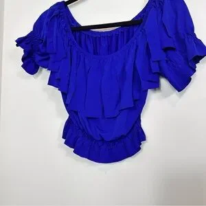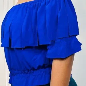 Turn heads in this vibrant royal blue crop top! Featuring layered ruffle detailing on the front and sleeves, this playful and flirty piece adds texture and movement to any outfit. The elasticized neckline, waist, and sleeves offer a comfortable and flattering fit, perfect for summer days or a night out.