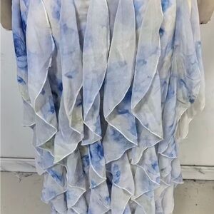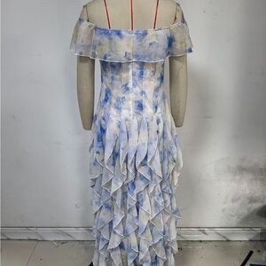 A flowing off-shoulder maxi dress with soft blue watercolor print on a white base. Lightweight fabric and layered ruffle skirt create romantic movement. Designed for effortless evening or special-occasion wear. Includes blue and white tones for a fresh, feminine look.