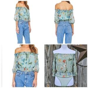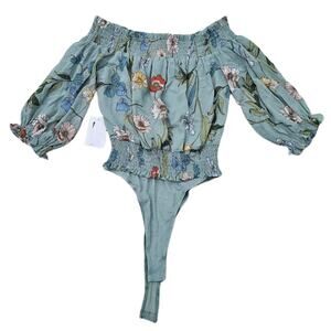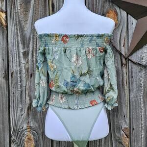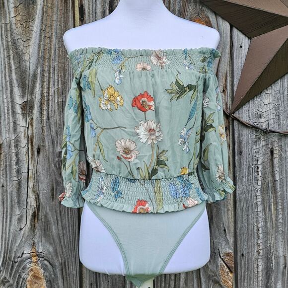 OffShoulder Bodysuit ASTR Lucy Size XS Sage Green Floral Smocked Ruffle Crop NWT