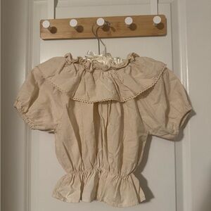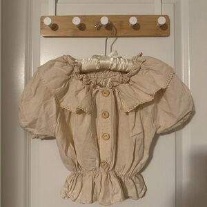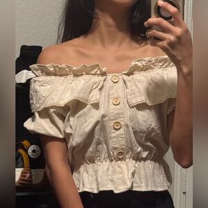 Chic off-shoulder top in a soft cream color, featuring a stylish button-up design. Perfect for casual outings.