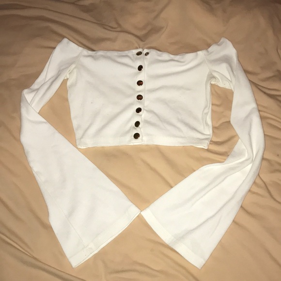off the shoulder white crop top with working gold buttons and bell sleeves from BOOHOO