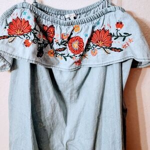 Chic off-shoulder dress with vibrant floral embroidery. Perfect for casual outings.